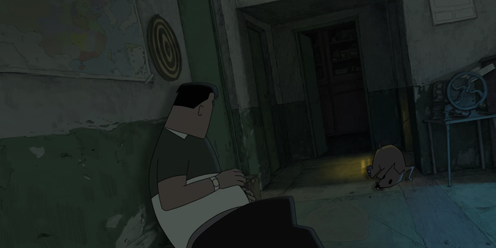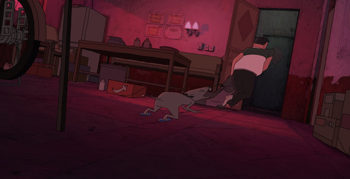 片中的醉酒者眼中,妻子和孩子都以老鼠的形象出现,是他要搏斗驱赶的对象。之所以选择老鼠的形象,一来因为导演小时候生活的城乡结合部就有很多老鼠,经常会在楼梯间等角落里闪过它们的身影,就像片中所呈现的那样;其次,老鼠本身有躲藏、弱小和不起眼的意味,也恰好是妻子和孩子这两个家庭成员的处境的隐喻。“短片里的老鼠并不是一个不好的比喻,只是醉酒者眼中他家人的样子,酗酒施暴的人是不会认为他的家人是可爱的猫咪的。”