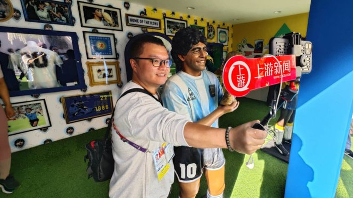 很多阿根廷球迷都赶到这里与马拉多纳雕像合影,此外,室内的玻璃柜还展陈着马拉多纳和贝利穿过的球衣,现场还有美洲杯、南美解放者杯和南美杯的实物展陈。在现场的足球游戏区,上游新闻记者还像普通球迷那样体验了一把带球绕桩,成绩是11秒68。
