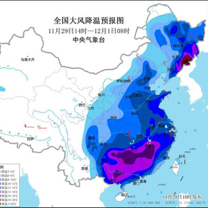11月27日至12月1日,中东部大部地区气温暴跌,局地降温超20℃,0℃线将抵达长江中下游一带,我国超20省区市将被寒潮速冻。