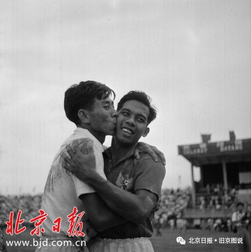 1957年,中国对印度尼西亚足球赛。我队以四比三获胜。首都的观众们如醉如狂掌声不绝。