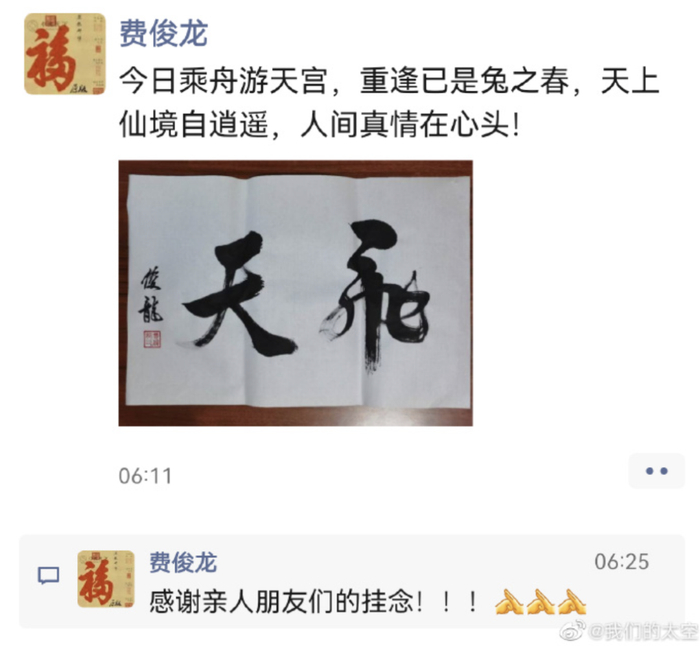 据@我们的太空 消息,今天早上,费俊龙发了一条朋友圈:今日乘舟游天宫,重逢已是兔之春,天上仙境自逍遥,人间真情在心头!感谢亲人朋友们的挂念!!!