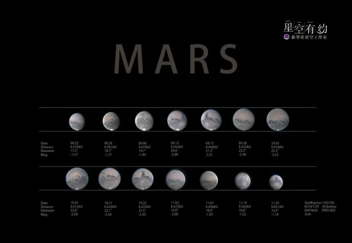 这是天津市天文爱好者王硕2020年历时数月,跟踪拍摄记录下火星在冲日前后由远到近,再逐渐远离的全程影像照片。(本人供图)