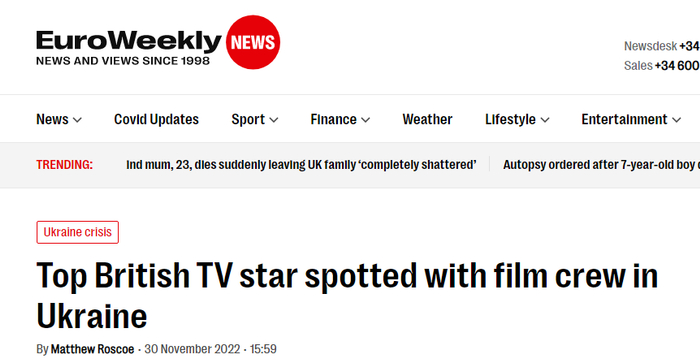 [环球网报道 记者 索炎琦]据“今日俄罗斯”(RT)电视台网站、西班牙《欧洲新闻周刊》网站等媒体报道,英国电视明星、探险家贝尔·格里尔斯现身乌克兰,相关视频图片于当地时间周三(11月30日)前后在网上出现,引发关注。