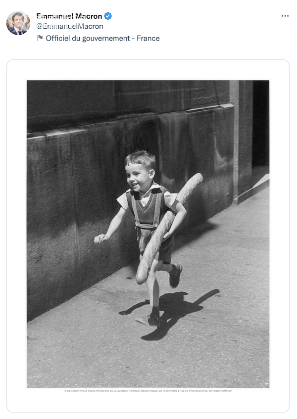 当地时间11月30日,正在美国进行国事访问的法国总统马克龙在法国驻美大使馆的一场活动上手举法棍进行了庆祝。此外,马克龙还在社交媒体上发布了一张小男孩拿着法棍奔跑的照片。