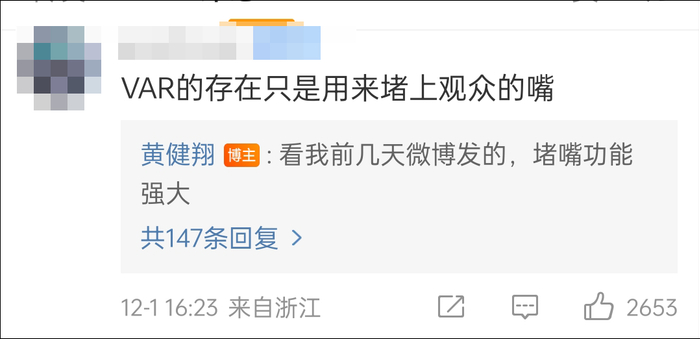 在与网友的互动中,黄健翔还表示VAR“堵嘴功能强大”,“权力集中上交,裁判变成木偶了。”