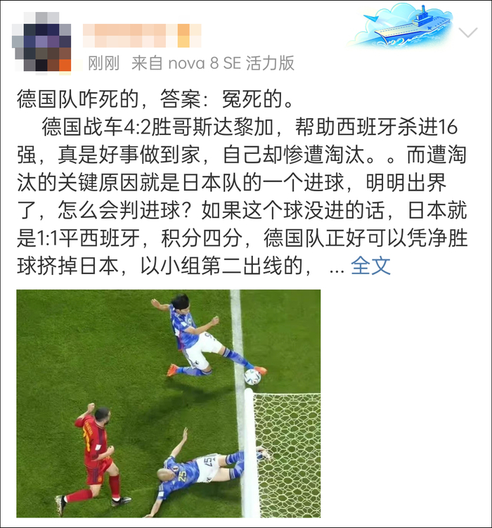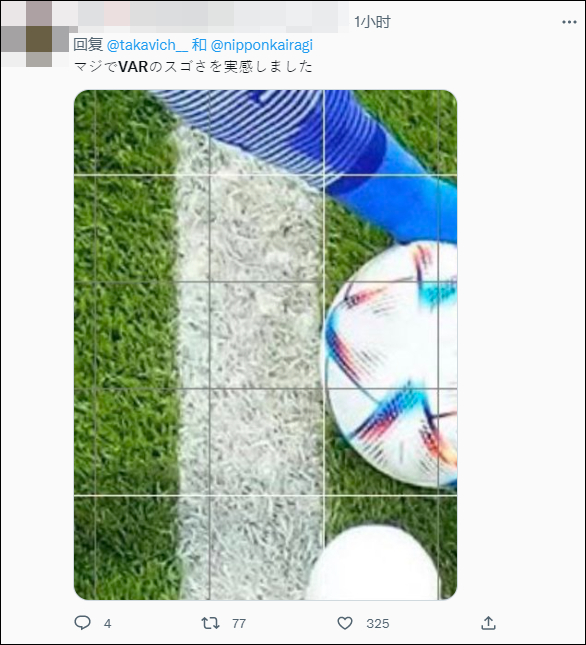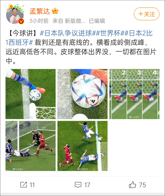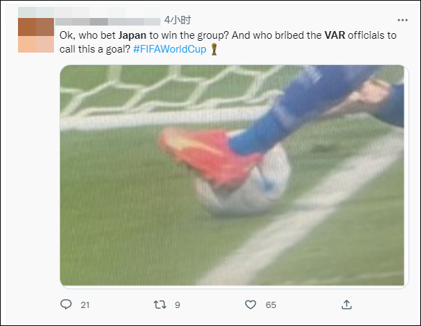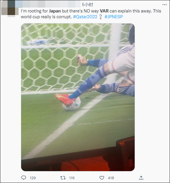有人慢镜头回放比赛录像,认定球就是出界了:“我支持日本,但VAR无法解释这一点。本届世界杯真的很腐败。”