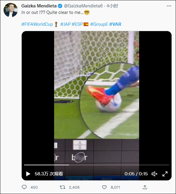 西班牙前职业足球运动员盖兹卡·门迭塔(Gaizka Mendieta)也晒出回放录像认定球已出界:“界内还是界外?对我来说一目了然。”