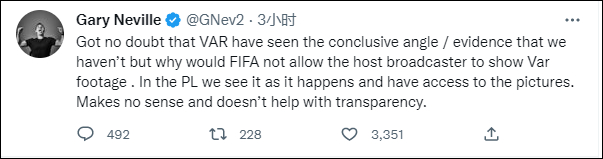 英格兰足坛名宿加里·内维尔(Gary Neville)则发推质疑道:“毫无疑问VAR看到了我们还没有看到的决定性角度/证据,但为什么不播给我们看呢?在英超,我们可以看到事件发生过程并能看到图片。这样做没有意义,也无助于提高透明度。”