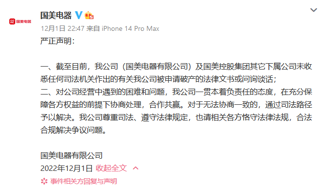 [回顾:国美要破产了?公司紧急回应!]