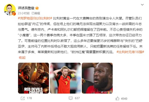 在和克罗地亚对决之前,外界就对“欧洲红魔”能否出线表达悲观态度。而当小组赛F轮第3轮比赛的终场哨声吹响之后,和克罗地亚队战成平局的比利时队在积分榜上位列第三,就这样和出线名额失之交臂。比利时队的“黄金一代”在绿茵球场上的告别演出以无缘淘汰赛的方式结束,还是令不少人为之惋惜,甚至失望。