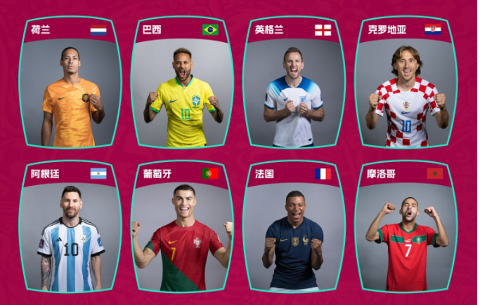 八支球队里,欧洲队占据5席,分别是法国队、英格兰队、荷兰队、克罗地亚队和葡萄牙队。南美球队是巴西和阿根廷队,摩洛哥队是非洲区的独苗。