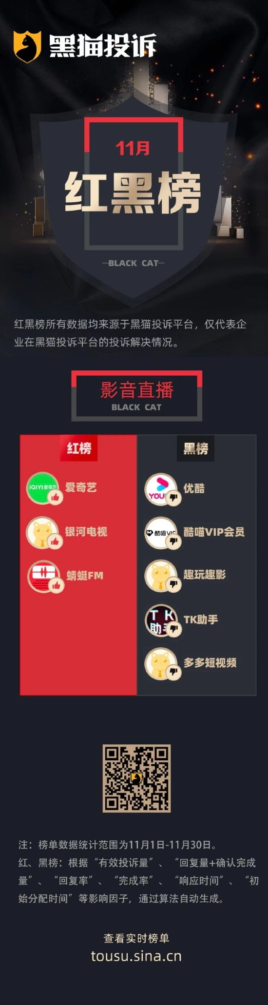 11月黑猫投诉影音直播领域红黑榜:优酷会员芝麻go活动问题多