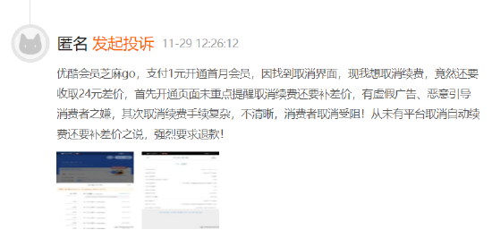据黑猫投诉数据显示,优酷11月有效投诉单396单,用户投诉称在芝麻go月月省活动中,页面仅显示的是1元每月会员,购买之后才显示后面每月12元的扣款。关闭任务还要扣款24元,一共扣了25元,诱导消费者。平台上还有其他消费者投诉优酷会员扣费问题,投诉原因主要集中于未经提醒自动续费、会员订阅退订难等相关问题。截至11月底,优酷在黑猫平台共收到投诉9200余单,回复率不足2%。
