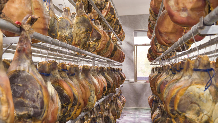 一只合格的金华火腿,需经历上盐腌制、浸泡晾晒、高温发酵、修正定型、堆叠验香等多道工序,成就金华火腿色香味形“四绝”的技艺,已流传一千四百余年。