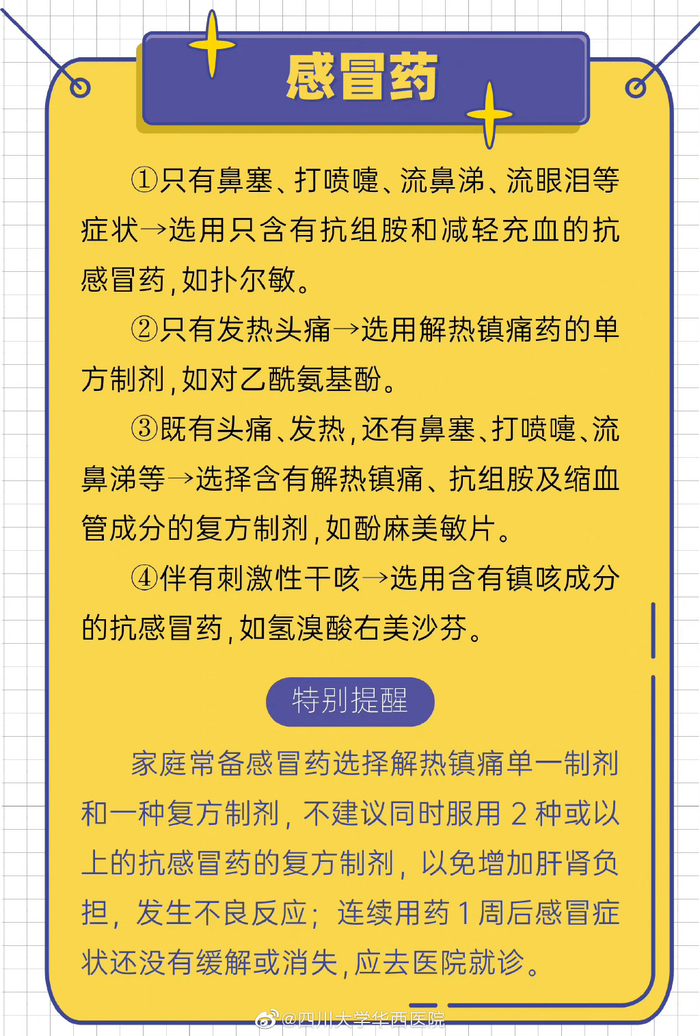 12月10日,四川大学华西医院的官方微博为大家总结了几种常见感冒药的吃法: