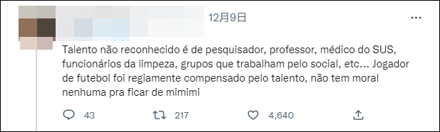 还有人指责卡卡没有道德立场来说这种话:“未被认可的人才是研究人员、教授、医生、清洁工、社工团体等。足球运动员的天赋已经得到了丰厚的补偿,他没有道德来说这些话。”