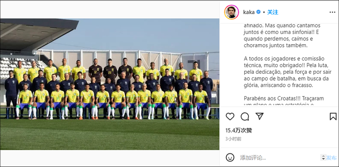 卡卡今天在Instagram上发文,没有回应自己言论引发的争议,而是为落败的巴西队送上安慰:“我知道这种痛苦,很疼。我参加了三届,赢了一届,输了两届……这是张集体照,我们输赢一起扛。”