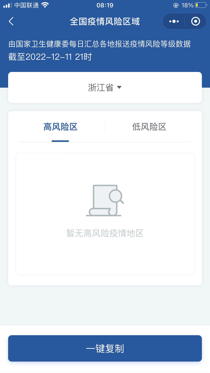 2020年3月30日,国家政务服务平台 “防疫健康码”整合 “通信大数据行程卡”相关信息,可在健康码中显示用户,是否去过中高风险地区等行程信息。第一财经记者发现,随着抗疫进入新形势面临新任务,尽管各地每天仍有新增报告病例,但部分省份已不再标记“中高风险区”。国务院客户端披露的信息中,截至2022年12月11日21时,重庆、浙江、安徽、江西、河北等5个省份已不再报告中高风险区。