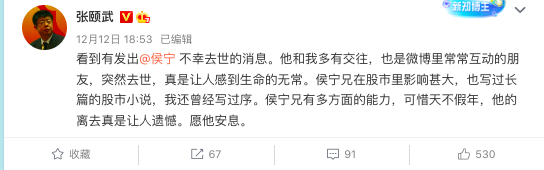 侯宁的最后一篇股市点评发表于11月13日,红星资本局注意到,侯宁去世消息传出后,不少网友在其微博下留言寄托哀思。
