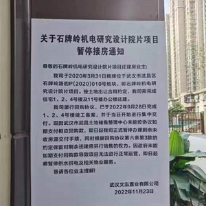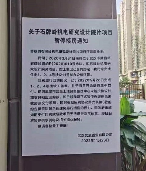 《暂停接房通知》称:“我司于2020年3月31日摘牌位于武汉市武昌区石牌岭路的P(2020)010号地块,即石牌岭机电研究设计院片项目。按土地出让合同约定,我司需完成住宅1、2、4号楼及11号楼办公楼还建。我司履行回购协议,已于2022年9月28日完成1、2、4号楼竣工备案,并于当日开始进行集中交付。现因武汉市武昌土地储备整理中心未能按协议如期支付相应回购款,即日起我司正式暂停办理剩余未收房源交付手续,同时根据回购协议第六条第3款的约定保留对剩余还建房另行销售的权力,因政府未能如期支付回购款导致项目无法进行正常运营,即日起将暂停供水供电及相关物业服务。”