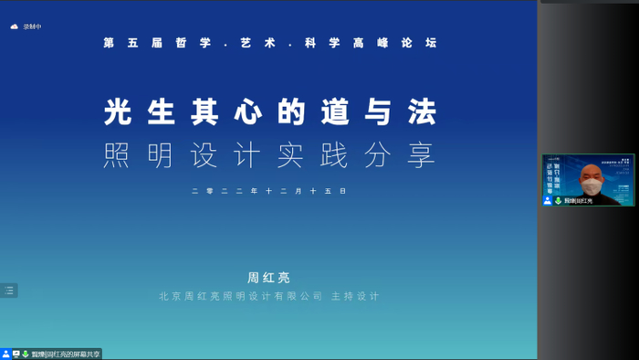 北京周红亮照明设计有限公司主持设计周红亮先生则选取了五台山真容寺、北京悉昙酒店、杭州海纳百川三个代表案例,回应了数字技术时代背景下“什么是最好的光”的话题。在他看来,照明设计的核心应该是“光生其心”,即用光带给人快乐、安详与和谐。
