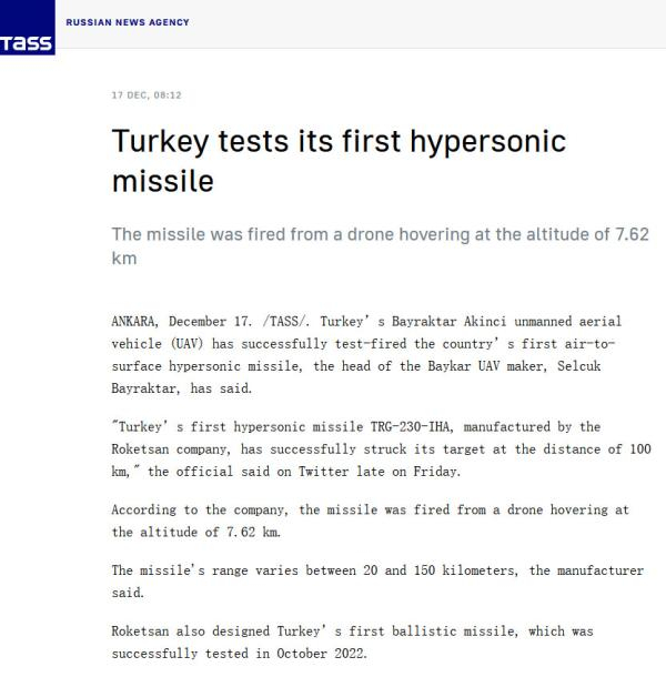 尽管土方发布的信息都是称“超音速”(supersonic),俄罗斯塔斯社今日却将其报道为“高超音速”(hypersonic),又拔高了一大截。虽然俄媒报道引发了一些误解,但这次试射确实体现了土耳其的雄心。