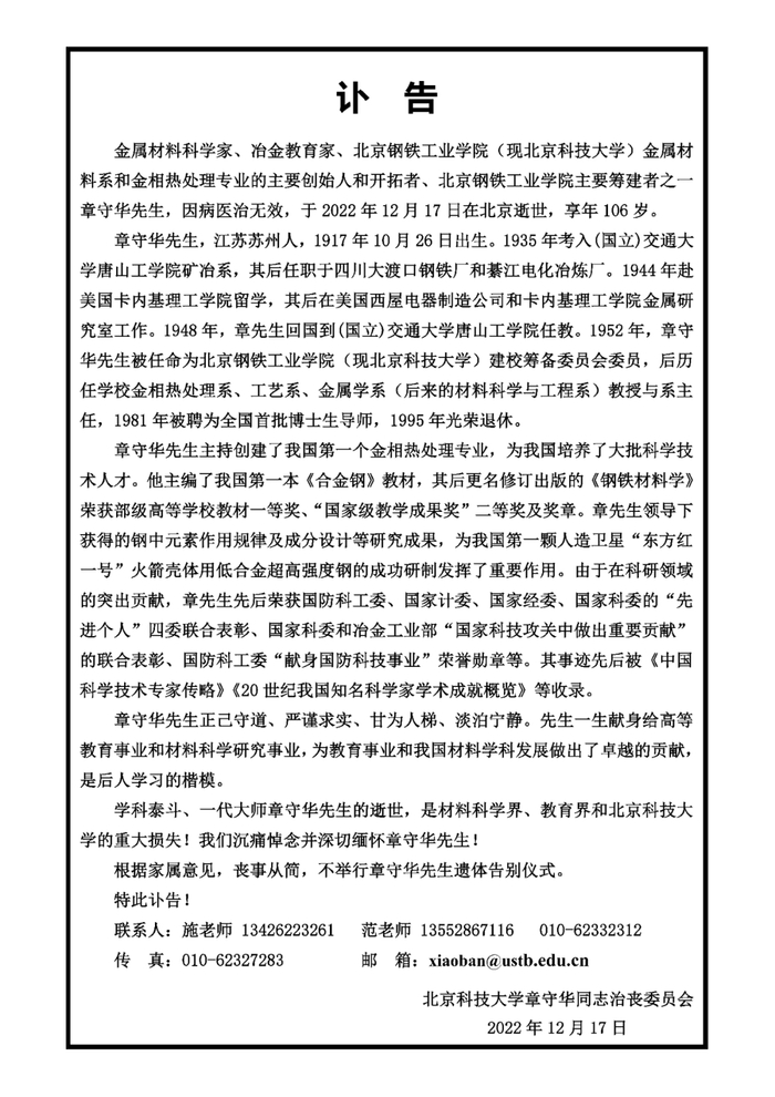1952年,经中央人民政府教育部报呈政务院文化教育委员会核准,北京钢铁工业学院(今北京科技大学)建校,同时章守华先生被任命为建校筹备委员会委员。章先生历任北京钢铁工业学院金相热处理系、工艺系、金属学系(后来的材料科学与工程系)的教授与系主任,1981年被聘为全国首批博士生导师,1995年光荣退休。
