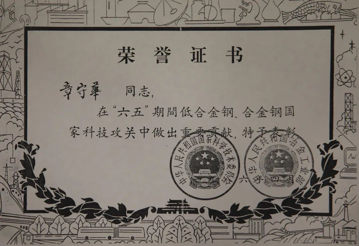 1977年,为求轧辊生产立足于国内,打破依赖进口的现状,冶金工业部成立了“武汉一米七轧机冷轧工作辊攻关组”,章先生任攻关组技术总负责人之一,带领北京钢铁学院研究团队负责实验室研究工作,为工业性生产的中间试验提供了可行的技术方案和可靠的工艺参数,并为保证产品质量提供了有效的检验方法。1980年,第一对国产冷轧工作辊在武钢试轧成功,1986年和1990年此种轧辊国产化率分别达到60%和100%,质量达到了同类进口轧辊的水平。该攻关课题获冶金工业部科学技术进步奖二等奖和国家科学技术进步奖三等奖。章先生在完成此项攻关任务中,起到了总体技术决策人的关键作用。通过这项攻关任务,培养了一批大型轧辊用钢及其热处理、冷热疲劳、接触疲劳、磨损、断裂等方面的学术带头人。