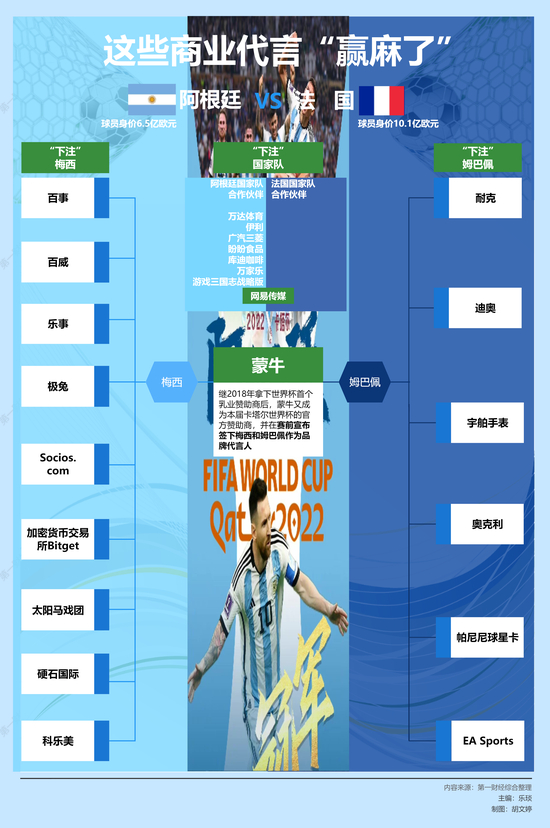 比如蒙牛继2018年拿下世界杯首个乳业赞助商后,又成为本届卡塔尔世界杯的官方赞助商,并在赛前宣布签下梅西和姆巴佩作为品牌代言人,两者最后成功会师决赛,蒙牛也被网友戏称“押题全对”。另一家“押对宝”的则是互联网行业的网易传媒,其签下了阿根廷国家队和法国国家队。
