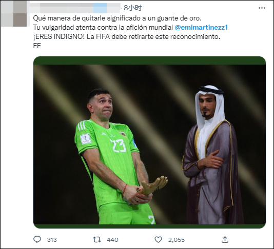 “这让金手套失去了意义,你的粗俗冒犯了全世界的球迷。马丁内斯,你不配!国际足联必须撤销给他的奖项。”
