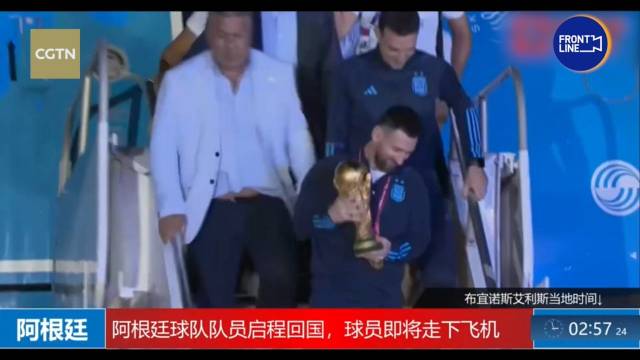 阿根廷队抵达布宜诺斯艾利斯,梅西手捧大力神杯下飞机