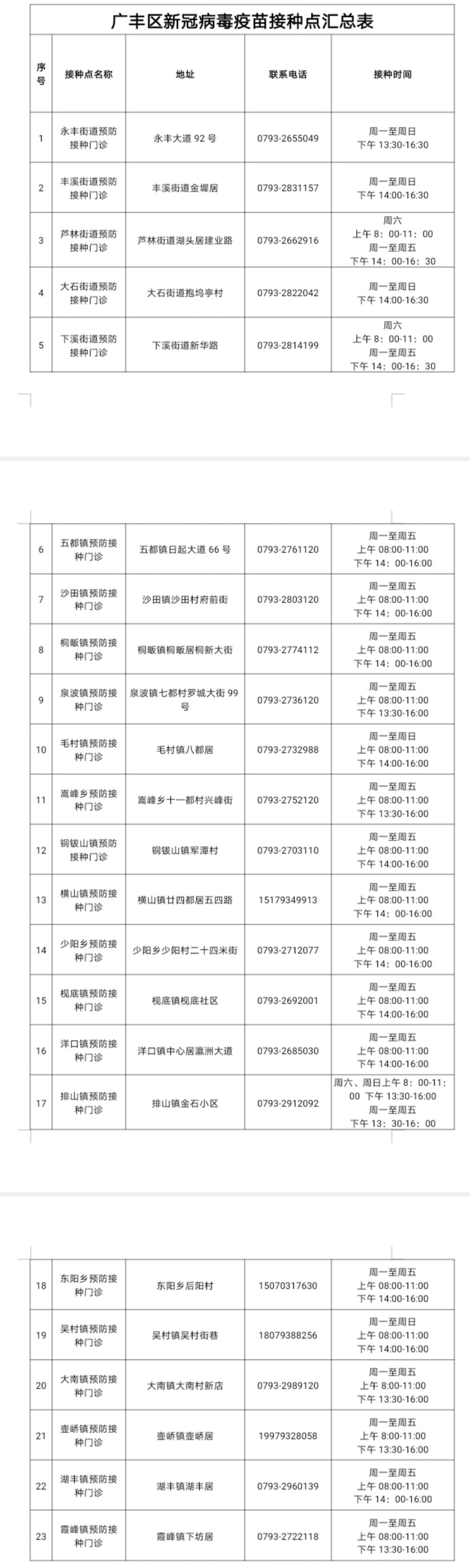 为进一步加快推进新冠病毒疫苗接种工作,保障人民群众生命安全和身体健康,广丰区新冠疫苗接种点信息表公布,请尚未接种疫苗的人群尤其是60周岁以上老年人尽快完成接种。