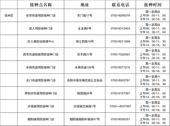 为进一步加快推进新冠病毒疫苗接种工作,保障人民群众生命安全和身体健康,信州区新冠疫苗接种点信息表公布,请尚未接种疫苗的人群尤其是60周岁以上老年人尽快前来接种。现阶段完成全程接种(第二针)满3个月的60岁及以上人群可实施加强免疫(第三针),符合条件者可根据国家有关要求选择同源加强序贯加强免疫接种。