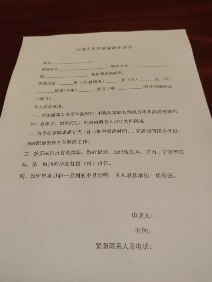 离开前,欢欢同样被要求签署了一份承诺书,上面写着“本人入境后机场及酒店核酸阴性,现申请居家隔离,承诺离店后上报社区,并完后续6天居家隔离”。