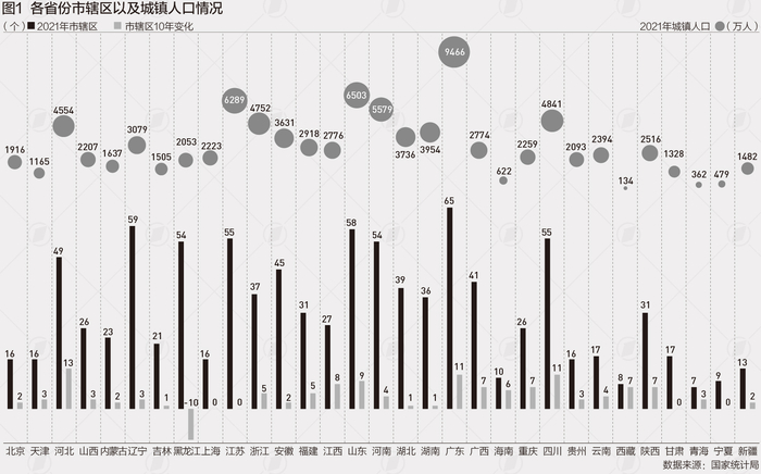 广东之后,共有6个省份的市辖区达50~60个,分别是辽宁、山东、江苏、四川、黑龙江和河南。其中,山东、江苏、四川、河南均为常住人口超过8000万的人口大省,城镇人口规模也比较大。比如,江苏和山东城镇人口均超过6000万人,河南5579万人,四川达到4841万人。