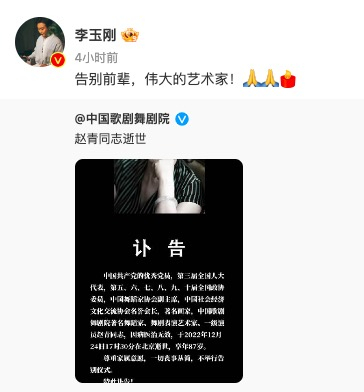 赵青去世的消息传来,青年艺术家、中国歌剧舞剧院一级演员李玉刚发文悼念:“告别前辈,伟大的艺术家!”