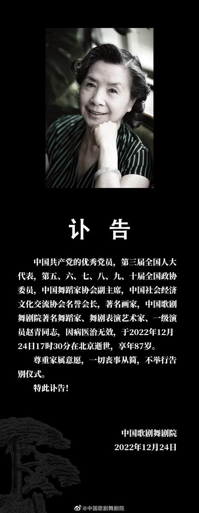 12月24日晚,中国歌剧舞剧院发布讣告:中国歌剧舞剧院著名舞蹈家、舞剧表演艺术家、一级演员赵青,因病医治无效,于12月24日在北京逝世,享年87岁。
