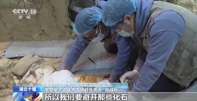 湖北省文物考古研究院副研究馆员 学堂梁子遗址考古项目负责人 陆成秋:很多地方都看不到,而且边上还有大量的化石,我们又不能破坏,所以我们要避开那些化石,空间很小,有时候只能用内窥镜,剔一剔、动一动、停一停,确认没有再剔,跟腹腔手术一样的。