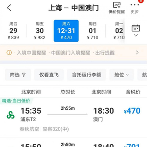以上海飞中国澳门为例,预订平台实时数据显示,12月31日,最低机票价格仅需470元,而元旦当天,最低机票价格则在700元。