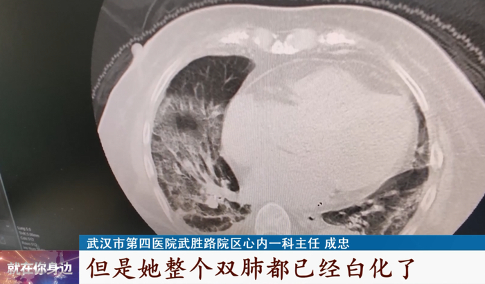 武汉第四医院心内科主任成忠实介绍,正常人的CT,肺部都是黑色,可吴婆婆送来后双肺都已经白化,缺氧非常严重,几天高流量氧治疗效果都不好,一度要上呼吸机。
