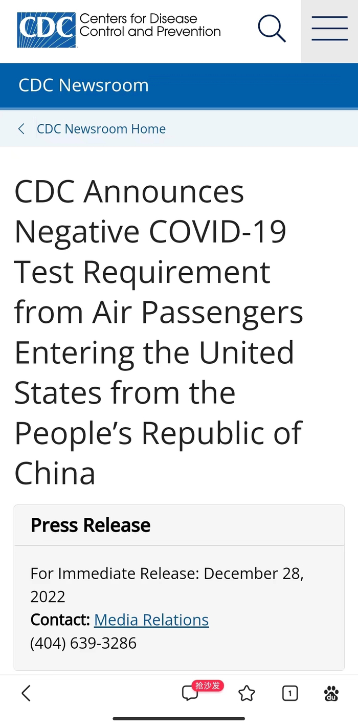 美国当地时间12月28日,美国疾病控制与预防中心(下称“CDC”)发布通告称,将自2023年1月5日起,对中国出发的乘客恢复新冠核酸检测要求。