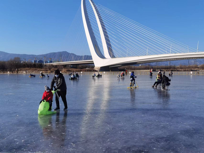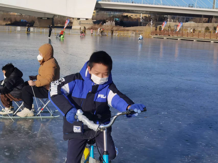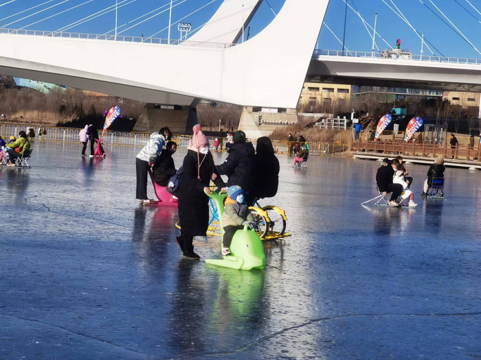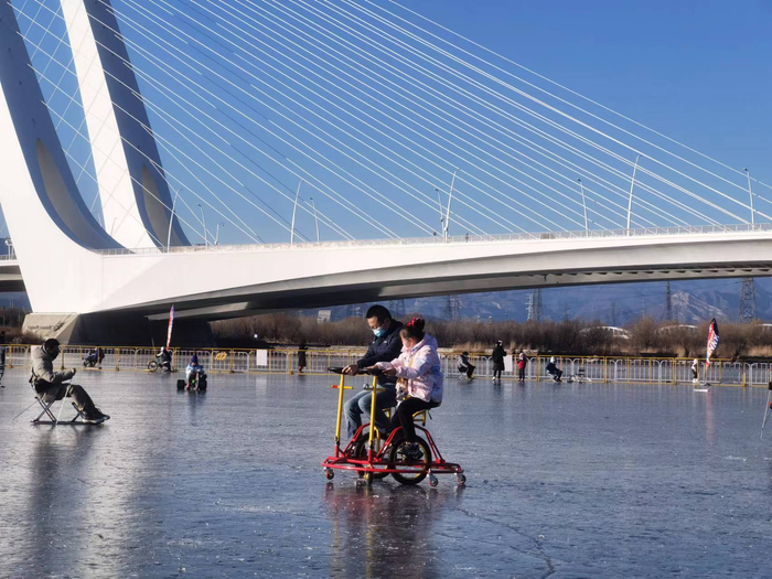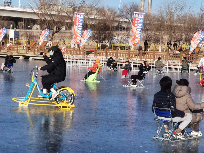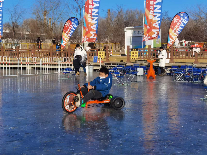 12月29日,市民在石景山区莲石湖冰场尽情体验冰上运动的乐趣。冰场除了滑冰、冰车,还设有冰上自行车、冰上漂移车等娱乐设施。