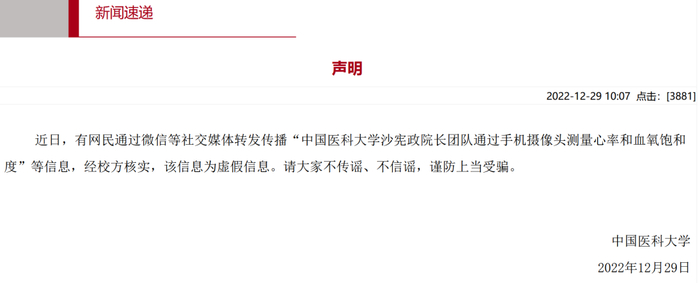 近日,有网民通过微信等社交媒体转发传播“中国医科大学沙宪政院长团队通过手机摄像头测量心率和血氧饱和度”等信息,经校方核实,该信息为虚假信息。请大家不传谣、不信谣,谨防上当受骗。