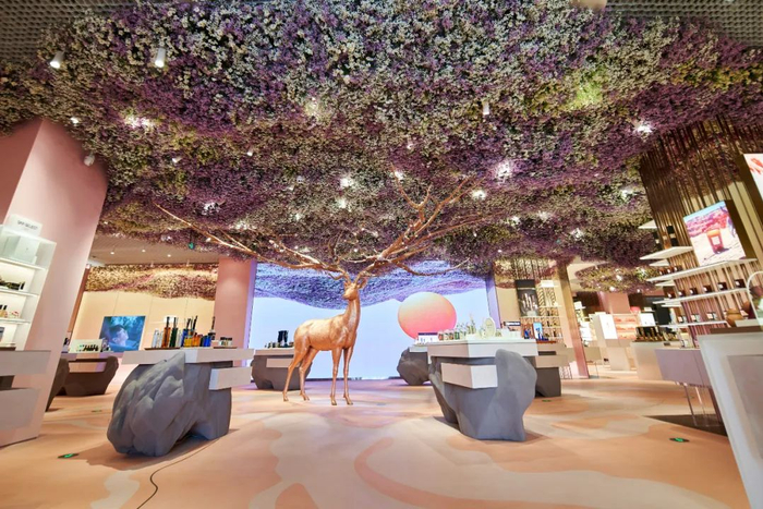 在SKPSELECT BEAUTY, 一只由 200 余块铜板纯手工锻造拼接而成的“森之精灵”跃然眼前,层层的鲜花在鹿角上绽放,仿若一处盛开的山谷。鹿身内置喷雾装置,可释放香氛水雾,亦可随需要调换味道,让消费者视觉与嗅觉的双重邂逅下,通往一个神奇的想象世界。