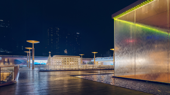 这是成都SKP标志性景观之一。六根观景水柱高度为26米、39米,由金属铝材料制成,柱身配有环形彩灯。相较于传统由下往上喷水的喷泉,景观水柱的水是由上至下流淌,意指天府之国的天上来水。
