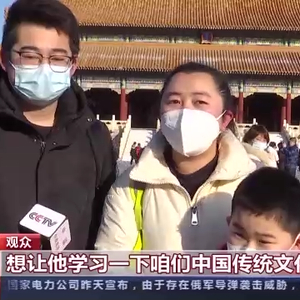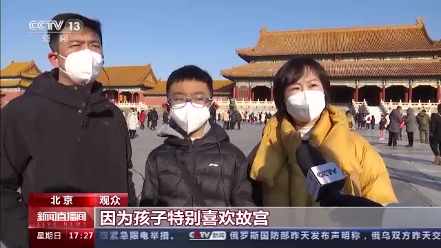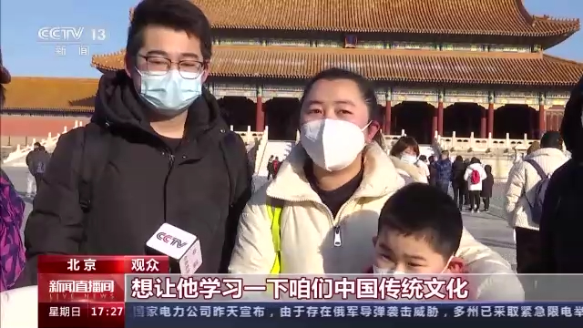 观众:我们是从辽宁丹东来的,因为孩子特别喜欢故宫,从小就对传统文化特别喜欢。这次来是冬天,我觉得带孩子来感受一下不同季节的故宫非常好。