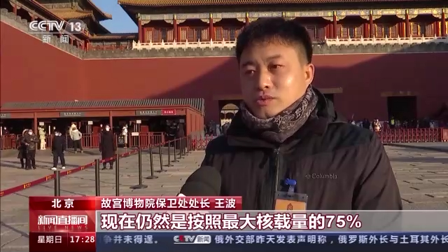 故宫博物院保卫处处长 王波:现在仍然是按照最大核载量的75%进行提前预约,假期的第二天预约的观众达到了3万人,达到了预约的上限。今年元旦假期参观的游客数量明显上升,而且已经开始接待旅行社。从参观客流的数量上观察到,大众的旅游热情已经在逐步地回升。