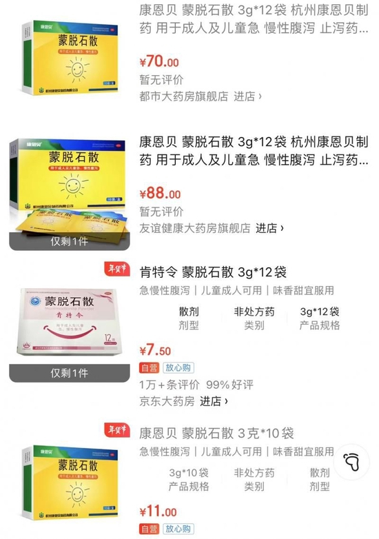 不仅是线下,北青报记者搜索多个线上售药平台发现,一些平台官方药店虽然有蒙脱石散在售,但是显示为北京地区“无货”。一些网店则把原本十几元一盒的蒙脱石散标价到了7、80元销售。还有网店则借机“蹭起了热度”,在商品标签上加上“蒙脱石散”后,再销售其他药品。