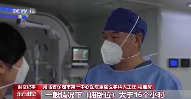 河北省保定市第一中心医院重症医学科大主任 程连房:一般情况下俯卧位要大于16个小时,他能坚持七八个小时都没问题,吃完饭休息一会再趴过来,效果确实是明显,这个病人就渡过了难关。