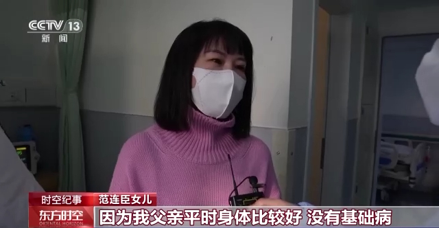 范连臣的女儿:因为我父亲平时身体比较好,没有基础病,所以当时发烧就有点大意,就认为吃两片退烧药可能就会好,结果没想到发展得这么快。血氧直接到六七十了,非常危险。